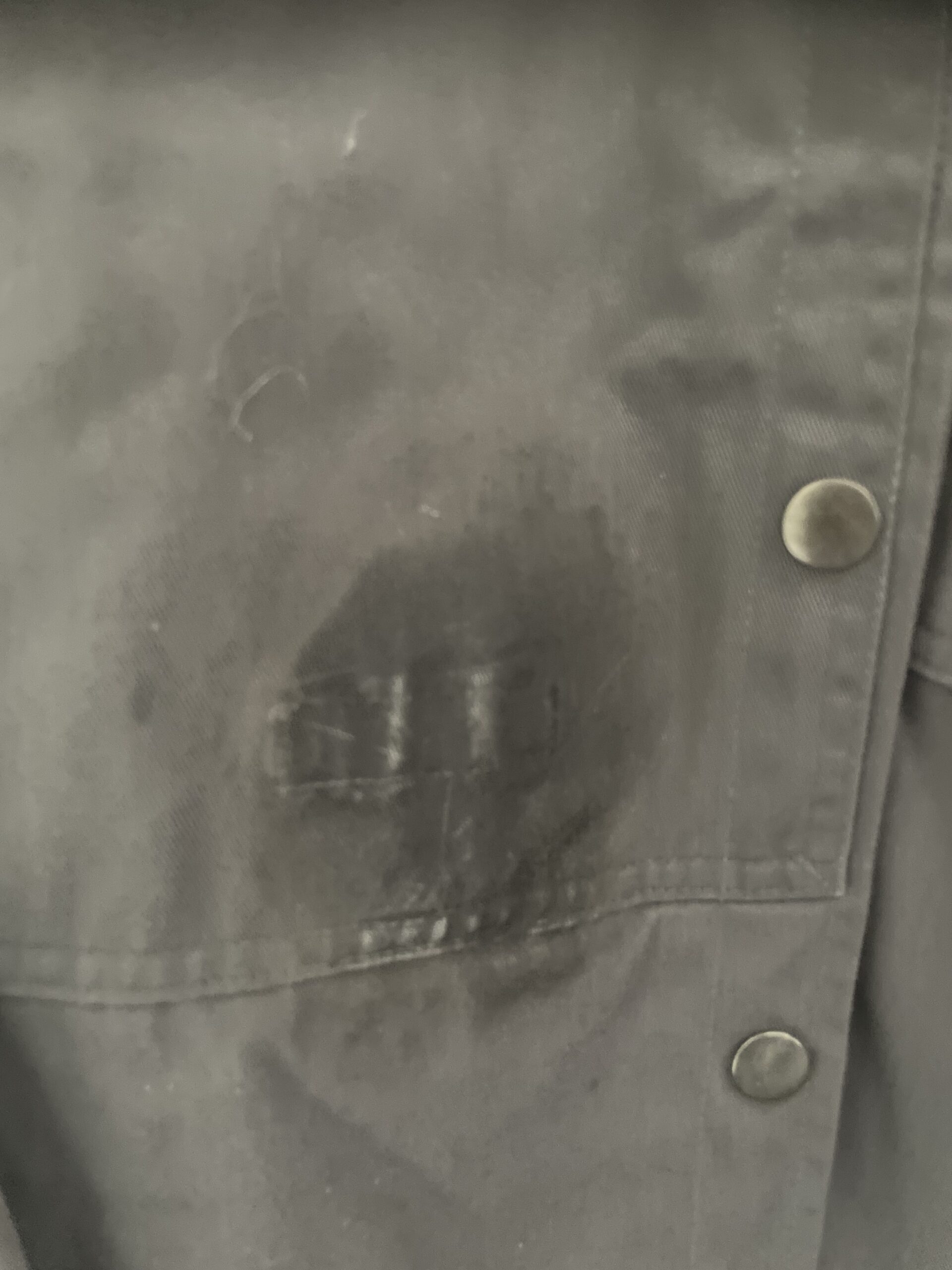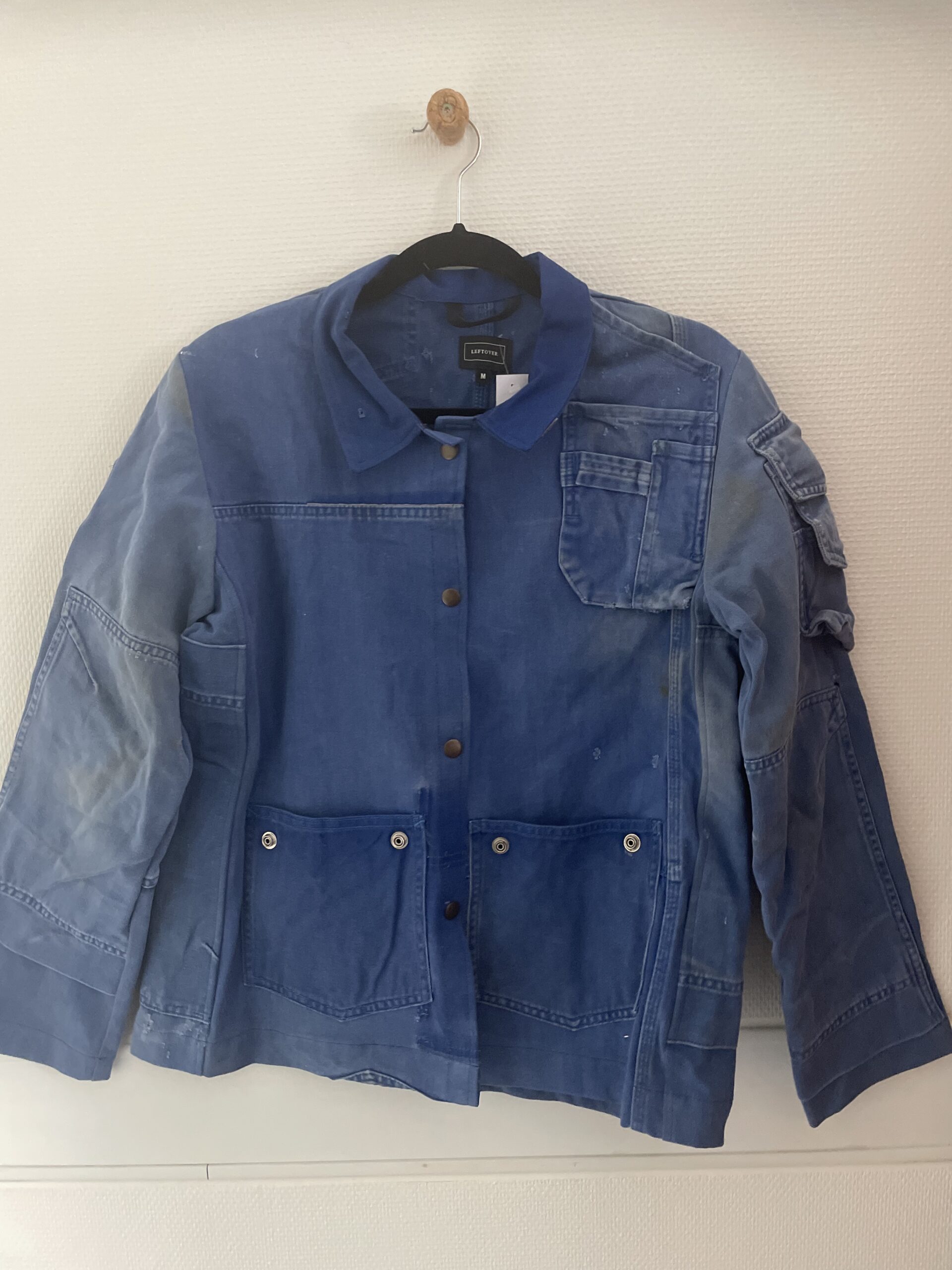 Lavet af kasseret arbejdstøj. Udseendet ændrer sig meget fra jakke til jakke.