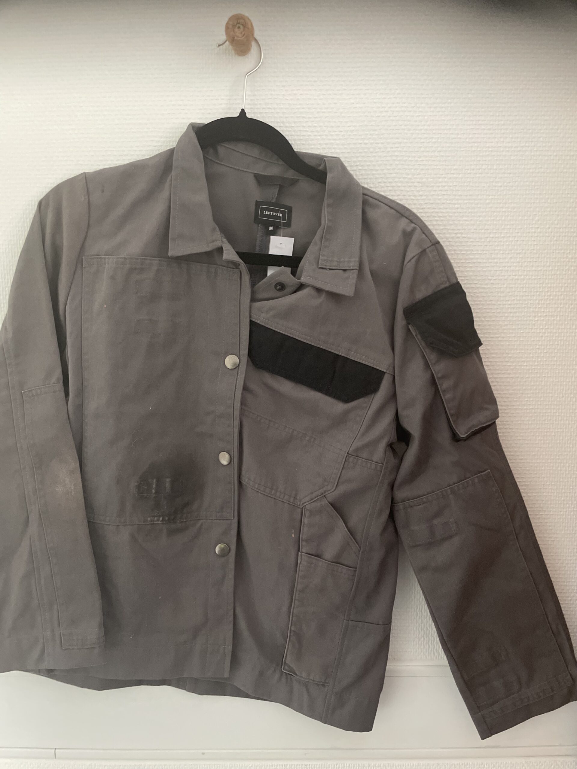 Lavet af kasseret arbejdstøj. Udseendet ændrer sig meget fra jakke til jakke. Der kan være pletter og huller i jakkerne. Dermed er stoffet udnyttet optimalt. 100 % genbrug af tekstiler, fra Textilias UPCY!-serie.